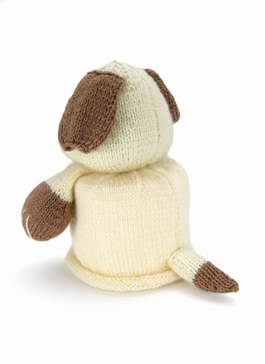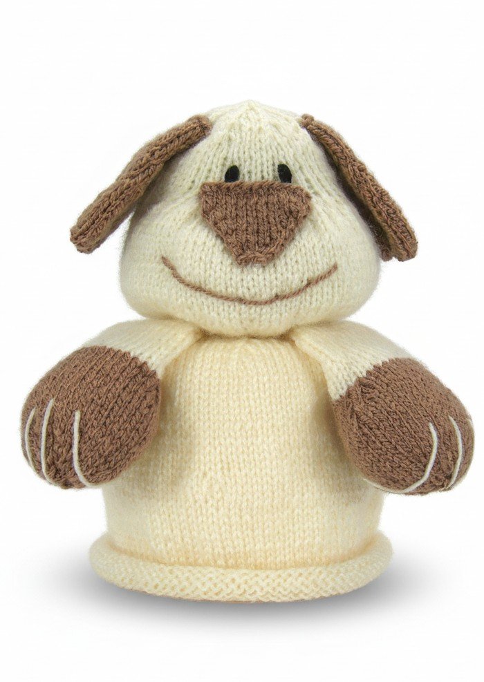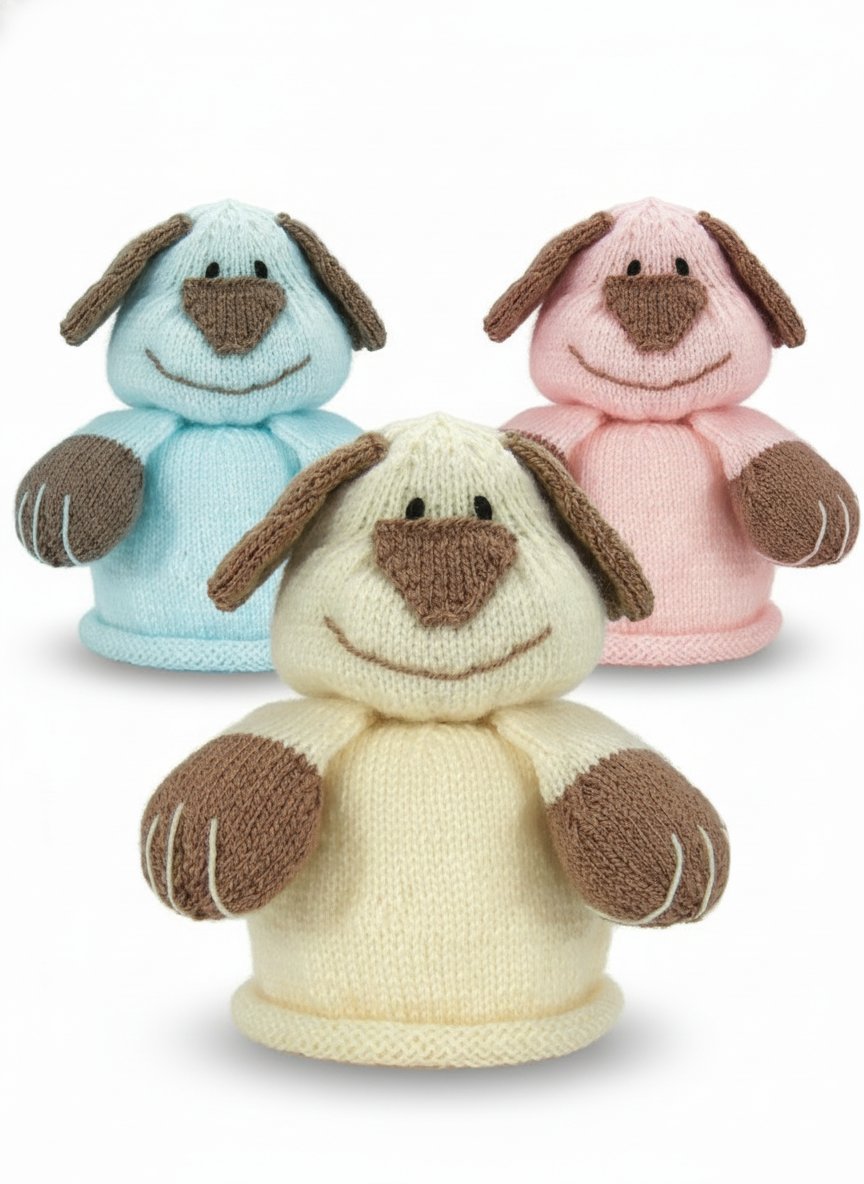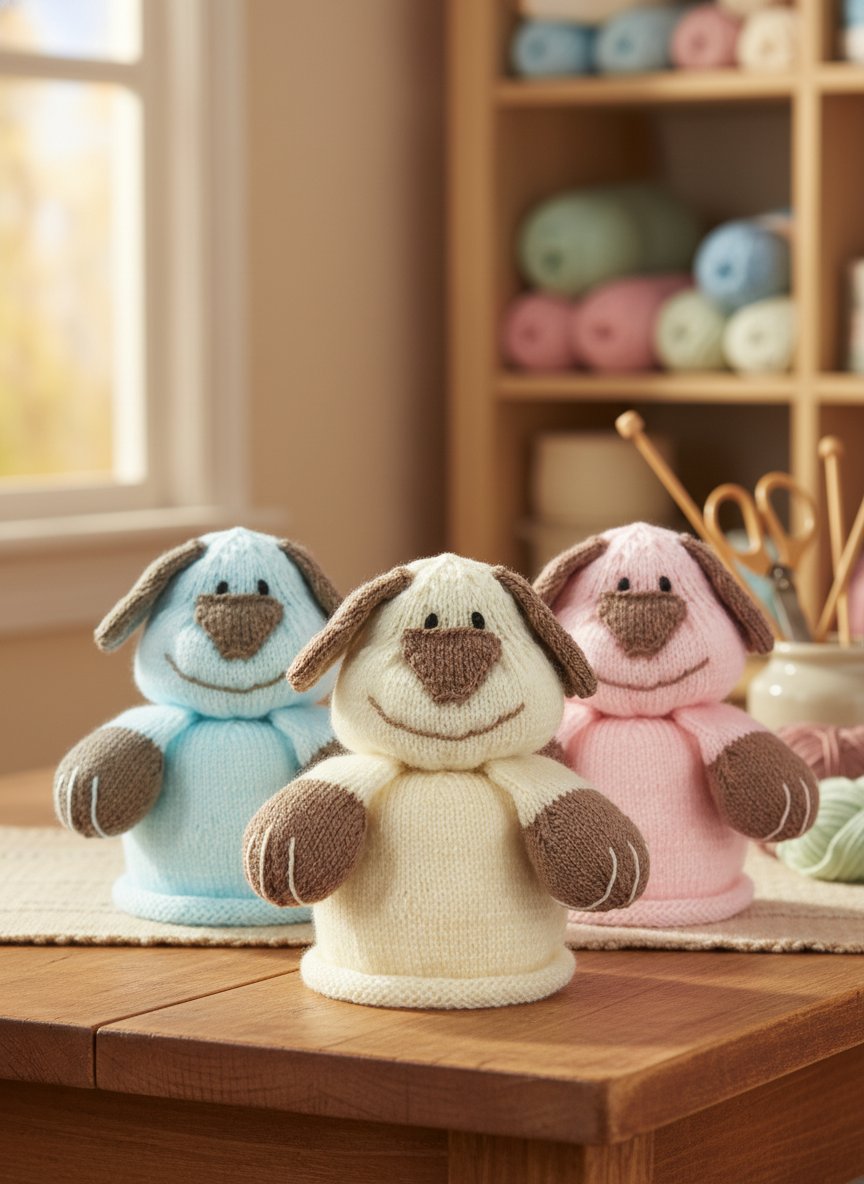This is a knitting pattern for a charming and soft knitted dog toilet roll cover, featuring a friendly face and floppy ears. The knitted doll pattern is perfect for creating a bathroom companion for children or a lovely gift for dog lovers, making it an ideal toy knitting pattern project.