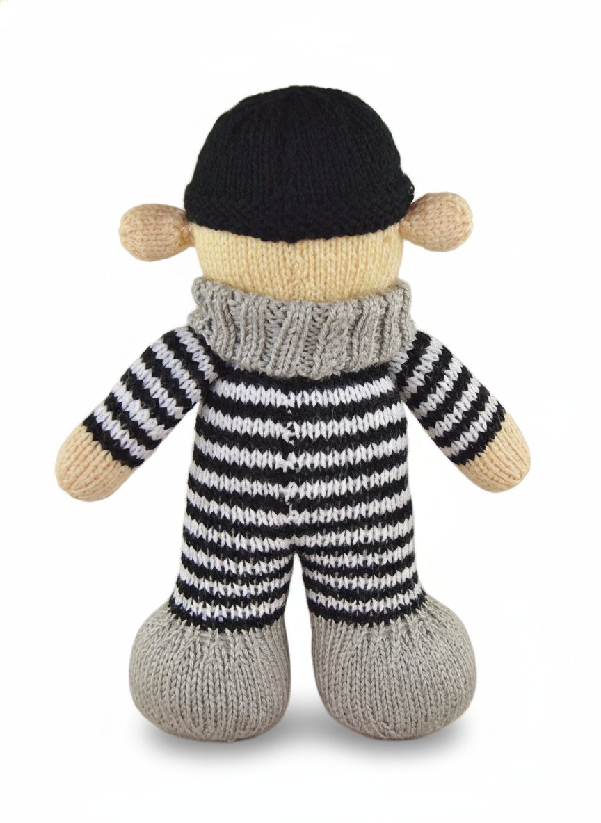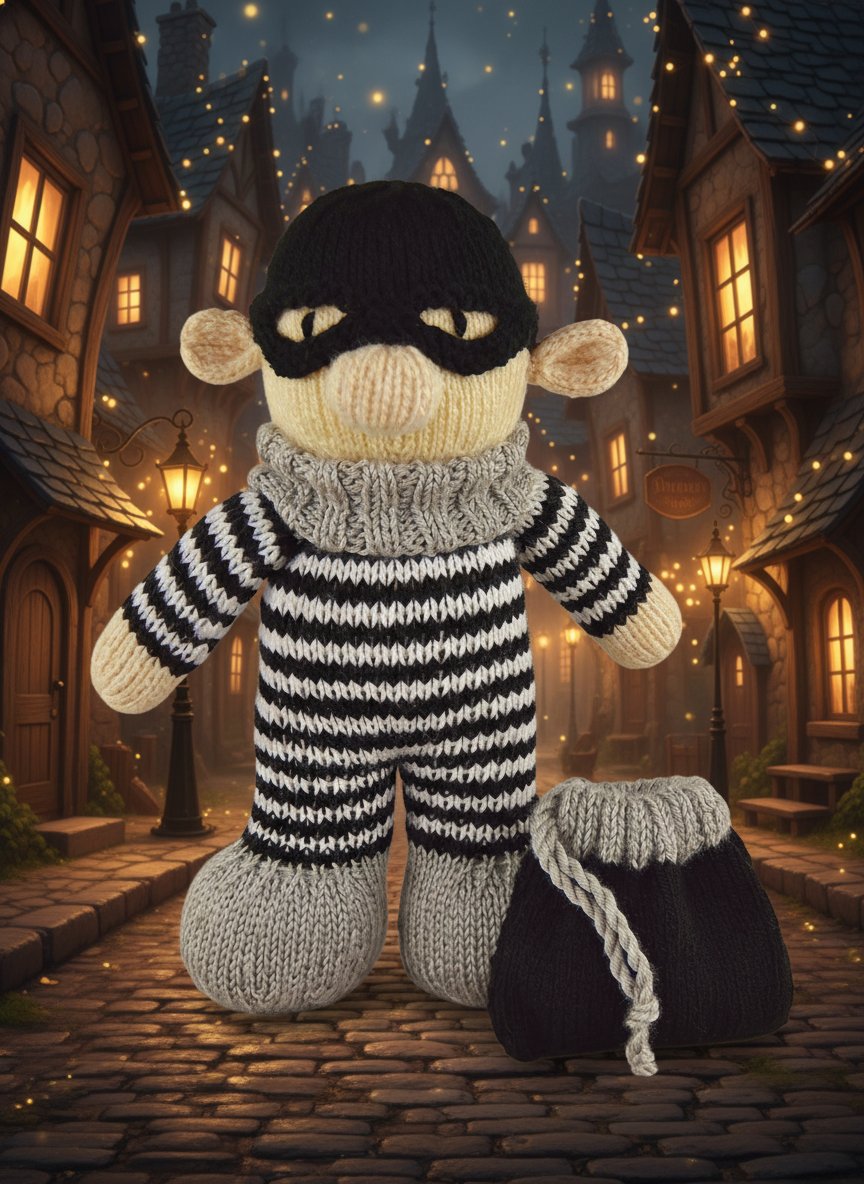 This is a knitting pattern for an adorable knitted robber doll, complete with a classic striped top, black mask, and a small loot bag. Create your own charming and mischievous character with this detailed toy knitting pattern. Perfect for crafters looking for a unique project.