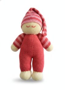 This is a knitting pattern for an adorable sleeping doll, perfect for beginners and experienced knitters alike. The knitted doll features a cosy long nightcap, closed embroidered eyes, and charming striped arms in shades of pink and cream. This toy knitting pattern is ideal for creating a cherished handmade gift.