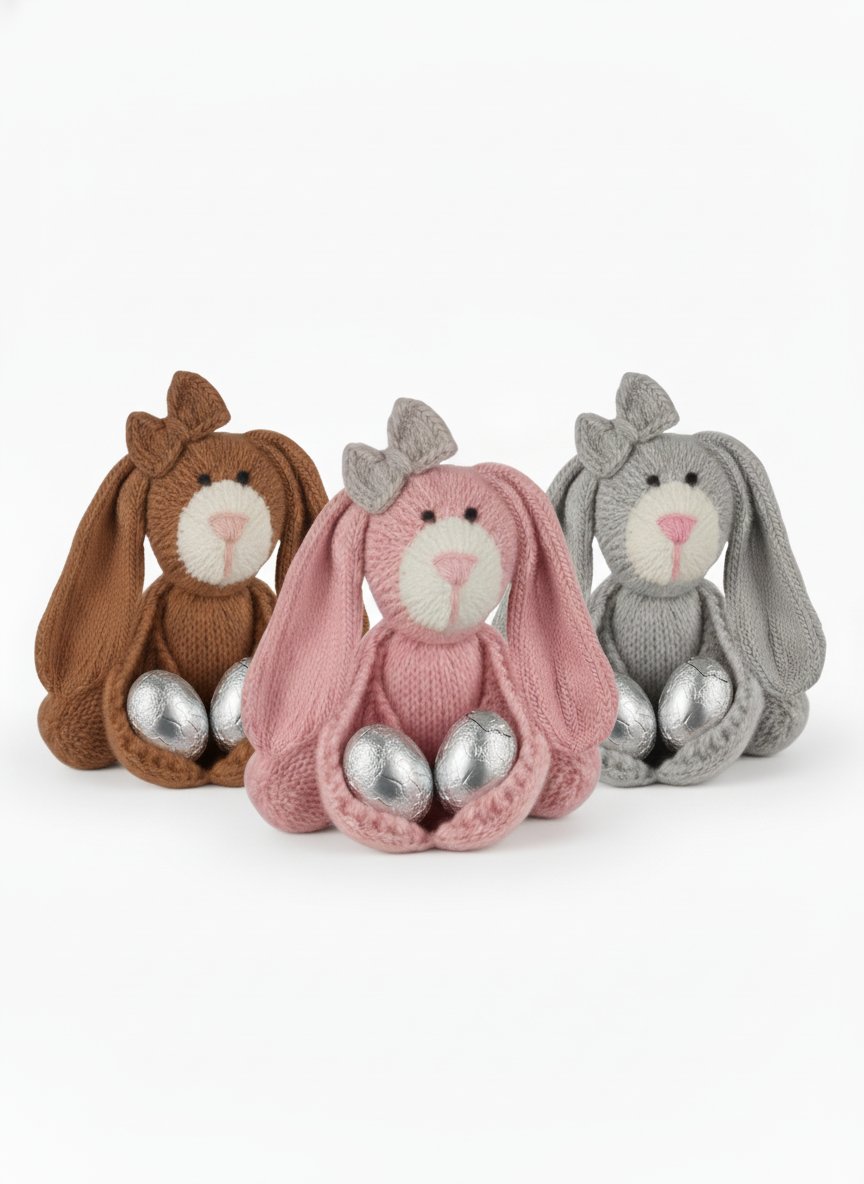 This is a knitting pattern for a charming knitted bunny doll with room for two small chocolate eggs at the front. The pattern allows you to create a sweet pink bunny with long ears and a cute grey bow, perfect for gifting or as an Easter toy. It’s a delightful knitted doll pattern suitable for various skill levels.