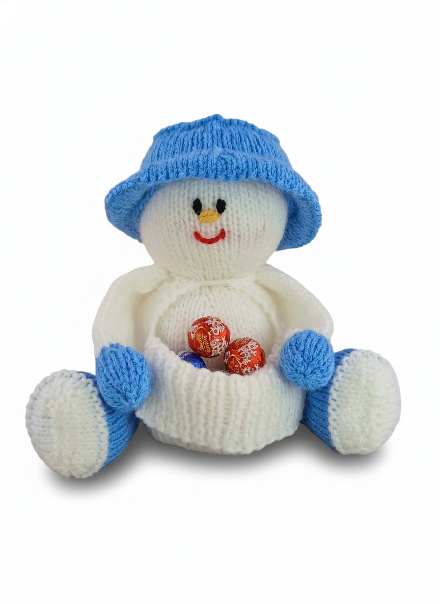 • Yarn: Double knitting. 50g white, 25g blue. Length of black, orange and red for face. Toy stuffing.